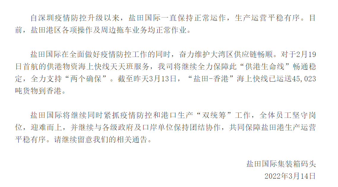 深圳各大港口企业作为保障城市运行及供港物资货运的保障的保障型企业,目前都在正常运行。3月14日,盐田国际集装箱码头与招商局港口(华南)营运中心均发布通告,表示旗下各港区生产作业平稳有序,供港生命线依然畅通稳定,各港区会在全面做好疫情防控工作的同时,继续配合各级政府及口岸单位,保障港口生产运营。同时,招商局港口(华南)营运中心也提示集卡司机在前往SCT、CCT、MCT闸口前自查健康码,码头将严格检查司机的行程码、绿码,非绿码一律禁止进入码头,同时上报疾控处理。