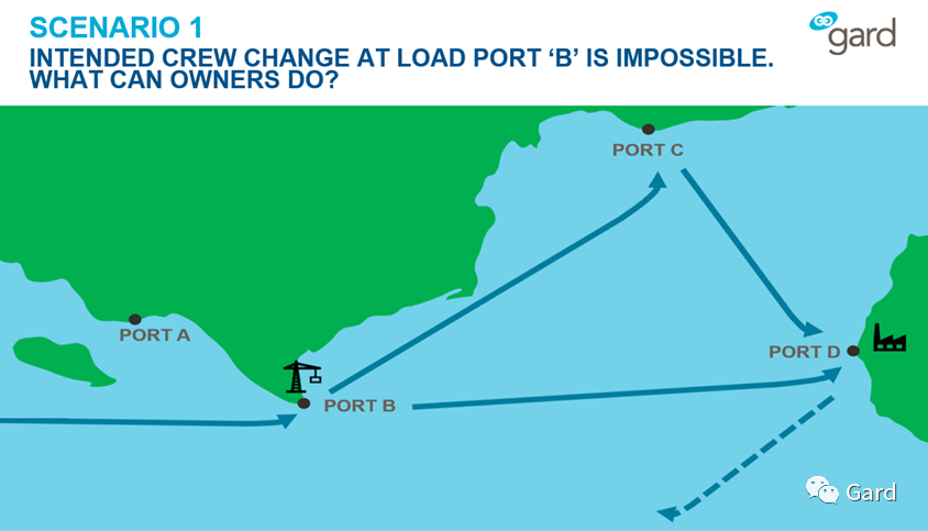 在本案例中,船舶空载驶往B港。几名船员已经超过了他们的最长合同期限,部分船员已经超过了《海事劳工公约》规定的11个月的期限。船东已计划在装货港B港更换船员,但在抵达前几天,B港的疫情情况恶化。所以B港改变了规定,不允许在那里更换船员。卸港D港本来不允许更换船员,所以不是一个选项。船东现在应该怎么做?船东应该去C港吗?还是等待未来的另一个机会?