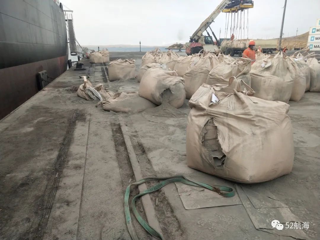 到达秘鲁PISCO港后,直接进港,靠泊后直接安排卸货。使用船上克令吊和一台岸吊卸货,卸货全程货舱内没有铲车协助。刚开始2天卸货进度和情况都正常,第3天后陆续发现问题且问题越来越棘手。