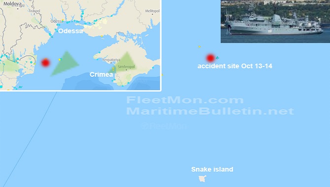 乌克兰海军消磁船 U-811 BALTA 于 10 月 13 日上午在敖德萨港(Odessa Port)以南的黑海,蛇岛(兹梅尼岛)附近,遭遇恶劣气象。两个船舱被淹,之后她被带到蛇岛抛锚,并得到搜救船只和拖船的协助。UTC(世界标准时)2000时报道,情况已得到控制,船舶处于稳定状态。