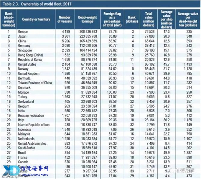通过总载重吨为计算,截至今年初,世界前5大船东国分别为希腊(3.09亿载重吨)后依次为日本、中国、德国、以及新加坡。