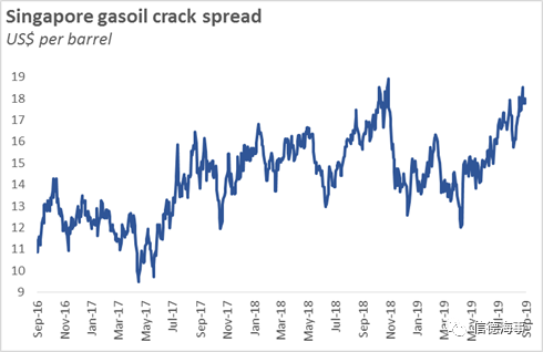 对更清洁燃料(硫含量更低)的需求不断增长也反映在炼油利润率上。新加坡gasoil价差飙升至6年来9月份的最高水平。且因最近对沙特阿拉伯石油设施的袭击可能会在未来几周收紧亚洲的供应,利润率可能进一步推高。