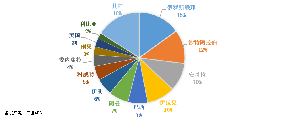 2018年的原油进口分布,其中15%来自俄罗斯联邦,40%来自中东地区,16%来自非洲以及11%来自南美洲,如下图所示,其中来自中东沙特地区原油就占到了总进口量12%。