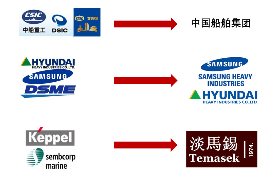 随着全球经济增速放缓和2014年以来海工低迷行情,全球造船与海工产业的三驾马车——中国,新加坡和韩国都在主动瘦身,大型造船与海工集团纷纷并购整合,中国的中船重工和中船集团将整合成中国船舶集团,韩国的现代重工收购大宇造船与海洋,新加坡淡马锡通过收购的方式控股该国两大修造船与海工集团。维持多年的全球造船与海工巨头的数量在2019年锐减。