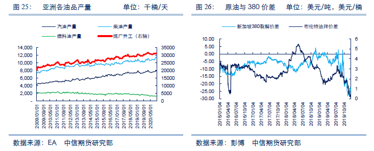 理论上来看,迪拜原油属于中质含硫原油,燃料油出率高,380裂解价差强将对迪拜原油带来支撑,因此380裂解价差强时布伦特-迪拜价差有一定概率弱(图中表现为负相关,之前相对吻合),但近期380裂解价差崩塌式下跌,原油价差反而不断走强,或证实随着亚太为代表的炼厂深加工能力不断增强,中质含硫原油的需求受380高硫燃油需求断崖式下滑的拖累有限,价差走强幅度或有限。