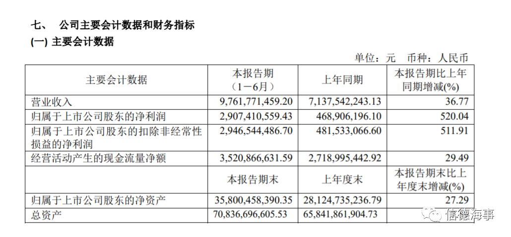 与招商轮船同时发布财务报告的中远海运集团旗下的中远海能上半年收入为97.61亿元(约合14.2亿美元),去年同期为71.38亿元(约合10.4亿美元),同比增长36.77%;上半年净利润为29.07亿元(约合4.23亿美元),去年同期为4.69亿元(0.68亿美元),同比暴增520.04%。