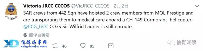 “船上机舱大火已经被扑灭,但是船舶仍处于失控状态,目前海警船Sir Wilfred Laurier 正在现场进行协助,救助拖轮正在赶往现场的陆上。”