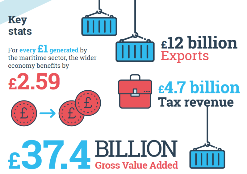 • 海事产业为英国做出了巨大的税收贡献。每年都为英国的财政部门筹集数十亿英镑,并且通过相当大的出口贸易量为国家贸易作出巨大贡献。整个产业在2015年为英国提供了约5亿元的税收、出口了价值120亿英镑的货物与服务,约占英国总出口额的2.3%。