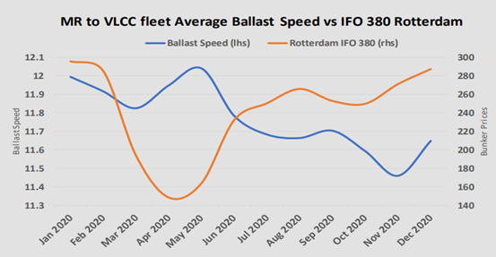 上图显示了2020年1月到12月,从MR(3.5万-5.5万载重吨中程油轮)到VLCC(30万吨超级油轮),油轮船队平均空驶航速与鹿特丹380船用燃料油价格的关系,空驶航速从国际油价开始V型反弹后的红五月就不断下挫。