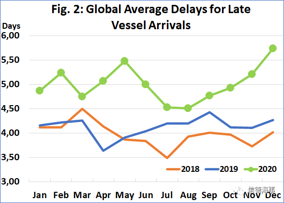 如上图表,2020年12月,全球集装箱船舶准班率降至44.6%,2020年6月后连续6个月下降。同时这也意味着自2011年Sea-Intelligence推出该基准数据以来,该指数连续第五个月处于历史最低水平。