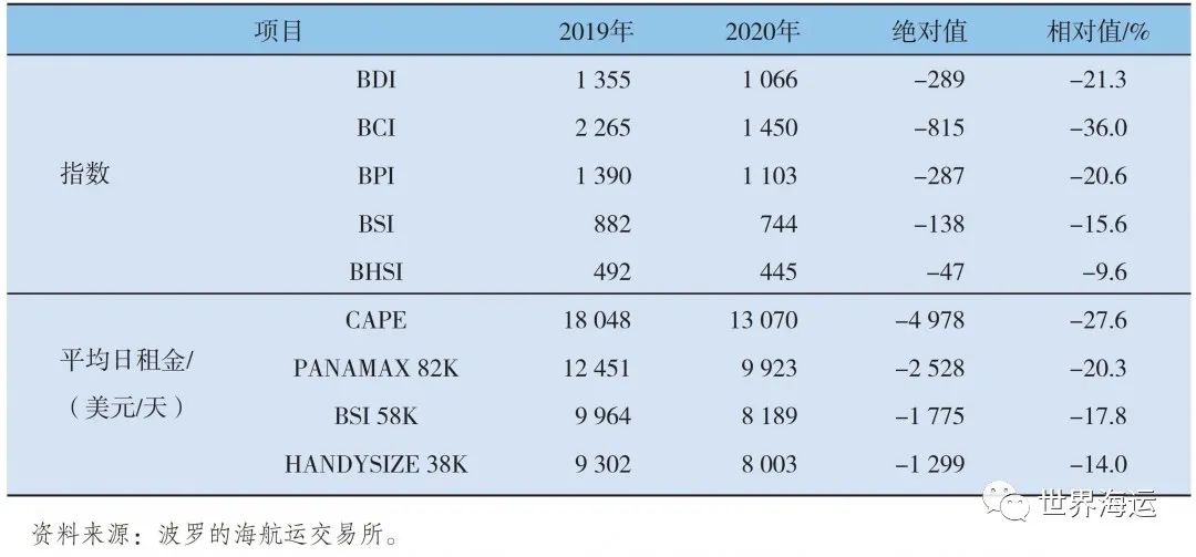 表1 2020年干散货指数、各船型平均租金水平及同比变化