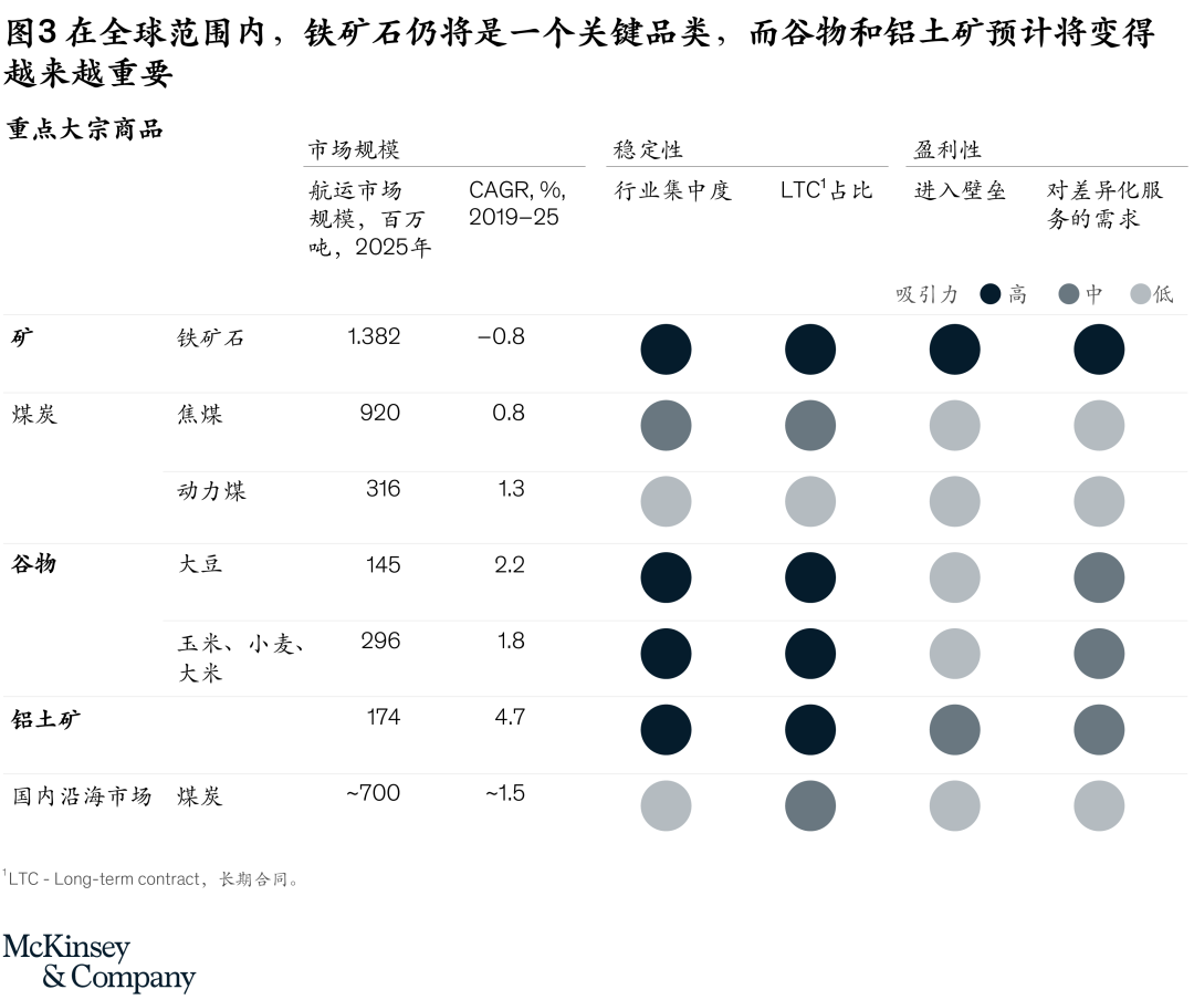 谷物和铝土矿的全球市场虽然较小,但却稳定,具有潜在的盈利能力。未来几年,这两个市场还将增长。大豆市场预计增速较快,将从2020年的1.3亿吨增加到2030年的1.63亿吨。铝土矿运输将在未来五年内快速增长,然后趋于稳定。铝土矿的供需格局也会改变。几内亚将贡献全球70%以上的铝土矿出口。中国将带动需求,预计到2023年,铝土矿将占中国从几内亚进口的80%。