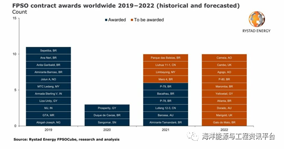 Rystad Energy能源服务研究分析师Aleksander Erstad表示:“承包商并没有停业,目前仍有20多艘FPSO在建,其中一艘可能已经于今年启动。但在经历了2020年的疲软之后,近期和预期中的合约将使项目数量翻倍,从而确保制造商在未来几年仍保持繁忙。”