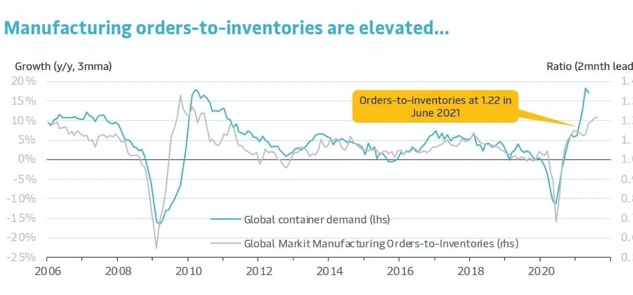 注:上图表中,2个月的交付周期是通过订单库存比与出口增长率推算而来。资料来源:牛津经济研究院(Oxford Economics)、IHS Markit、路孚特(Refinitiv)和马士基战略计算(Maersk Strategy Calculations)