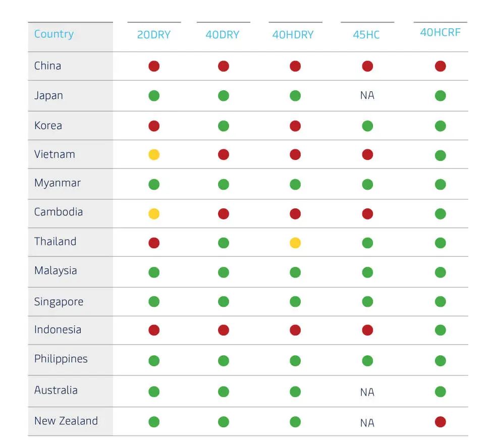 • 空箱短缺问题仍然是亚太地区全行业面临的挑战。强劲的出口需求、疫情导致的生产力下降以及疫情封锁导致整个供应链出现拥堵中断。亚洲的箱况在各国略有不同。中国、越南、柬埔寨和印尼的20尺干柜和40尺干柜的整体供应都处于短缺状态。马士基已经在今年夏季投资建造更多40尺高柜集装箱,以全力支持客户的出口需求,同时我们也在竭尽全力调运空箱回流至亚洲。请查看亚洲主要港口的最新箱况预估情况。(注意:此供应情况是根据当前供需情况来预估的,供需的变化都可能导致箱况缺口)