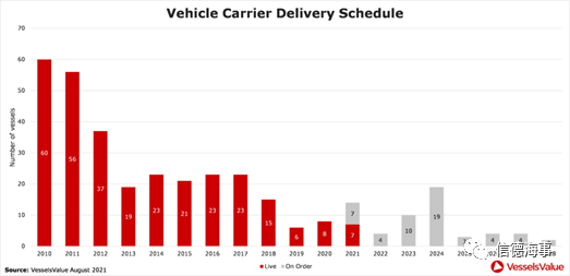 VesselValue认为,汽车运输船的价值上涨反映出市场的运力短缺,2016 年以来新订单量的持续低迷是主要原因。如果汽车运输船公司现在计划扩大运力,就只能订造新船。