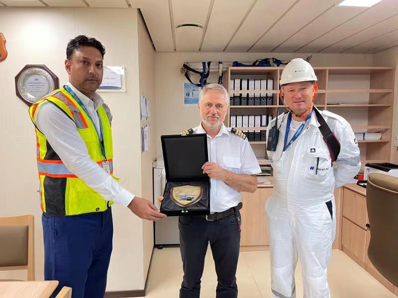 AL JMELIYAH轮首航靠泊后,CSP阿布扎比码头公司为船舶送去首航纪念品和欢迎函,对哈劳船东表示感谢。