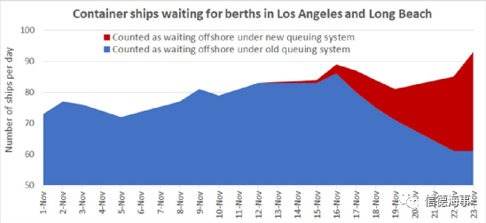 图1:美国托运人基于南加州海洋交易所的数据。Counted under old system::距离港口40 英里内的待泊船舶(主排队船舶队列)数量。Counted under new system:预计到达时间早于主排队列表时间的船舶数量。
