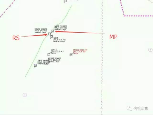 而RS用雷达第一次发现MP轮是在2200刚过不久,此时MP轮在其右前方大约5海里左右,按照此时的态势,MP将从右舷-左舷通过RS船头。