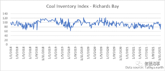 作为南非主要煤炭出口港口,理查德湾(Richards Bay)的煤炭库存水平在今年的大部分时间均呈下降趋势,但是在经历了国内动荡和火车脱轨之后有所改善。根据Tathya.earth的卫星数据,库存量的回升始于8月下旬。但当时正好赶上全球煤炭需求的回升,由于出口强劲,库存水平已从近期高点回落。