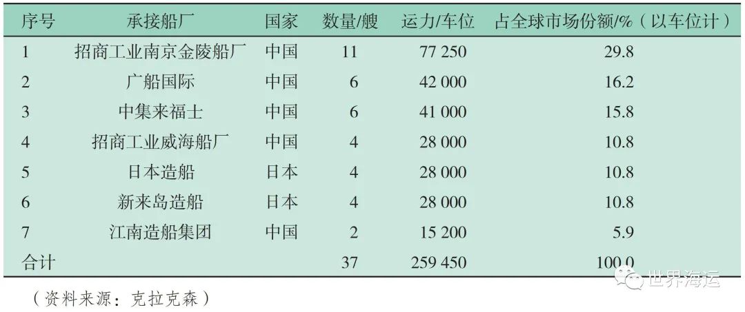 表1 2021年全球主要汽车运输船建造企业新船承接情况
