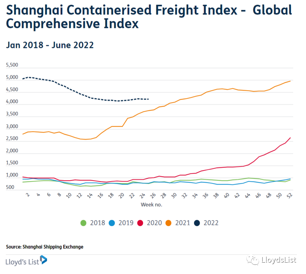 例如,上海出口集装箱运价指数已经跌回2021年6月的水平,而德鲁里的综合世界集装箱指数(World Container Index)同比下降了10%。
