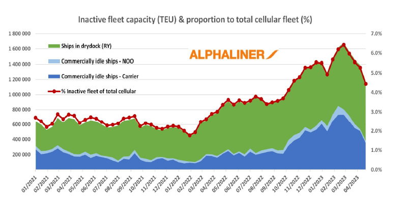 Alphaliner统计的不活跃船舶运力主要分为两部分,一部分是进坞(进行维修保养)船舶运力以及另一部分的商业上的闲置运力。