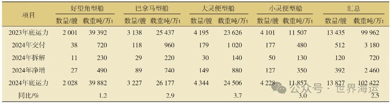 总体上看,按照目前的订单水平,预计2024年干散货新船交付3 180万t,老旧船拆解720万t,运力规模增速为2.5%左右,较2023年下降0.4个百分点。见表6。