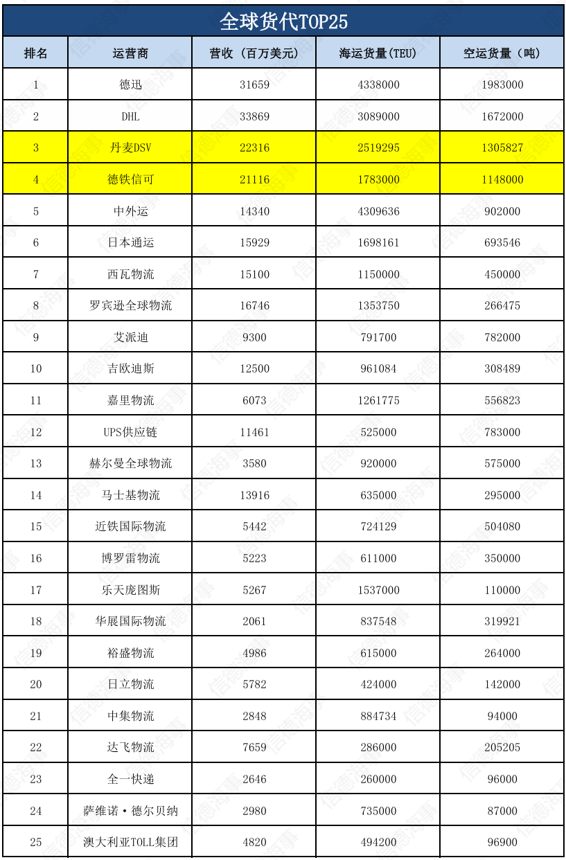 在收购完成后,无论是从货运量还是营业额来看,DSV-DB Schenker都将超越瑞士的德迅(Kuehne+Nagel)和排名第二的DHL。原本排名第五的中外运(Sinotrans)将排名第四。