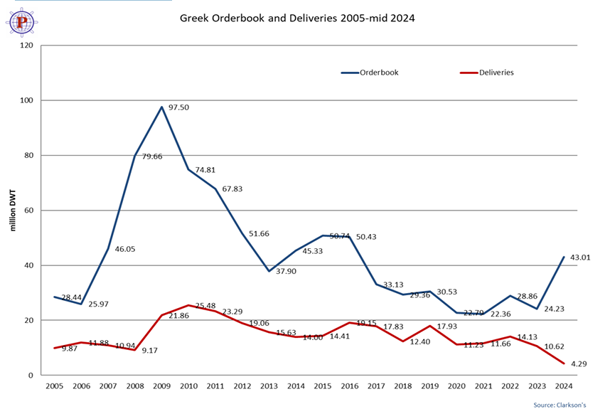有趣的是,在二手船方面,希腊船东在2022年、2023年和2024年上半年都在净卖出船只,这反映出当前二手船舶处于高价位。由于2023年,希腊方面拆船量大幅减少,又一直在卖出船舶,所以实际上,希腊船队的增长主要通过新造船交付实现。