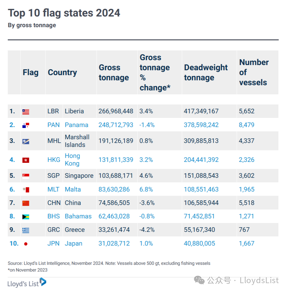 利比里亚在2023年结束了巴拿马连续20年位居榜首的纪录后,继续保持全球最大船旗国的地位。而被取代的巴拿马船旗国自上一期排名以来,船队规模有所下降,这可能是由于正在进行的“影子船队”油轮清理所致