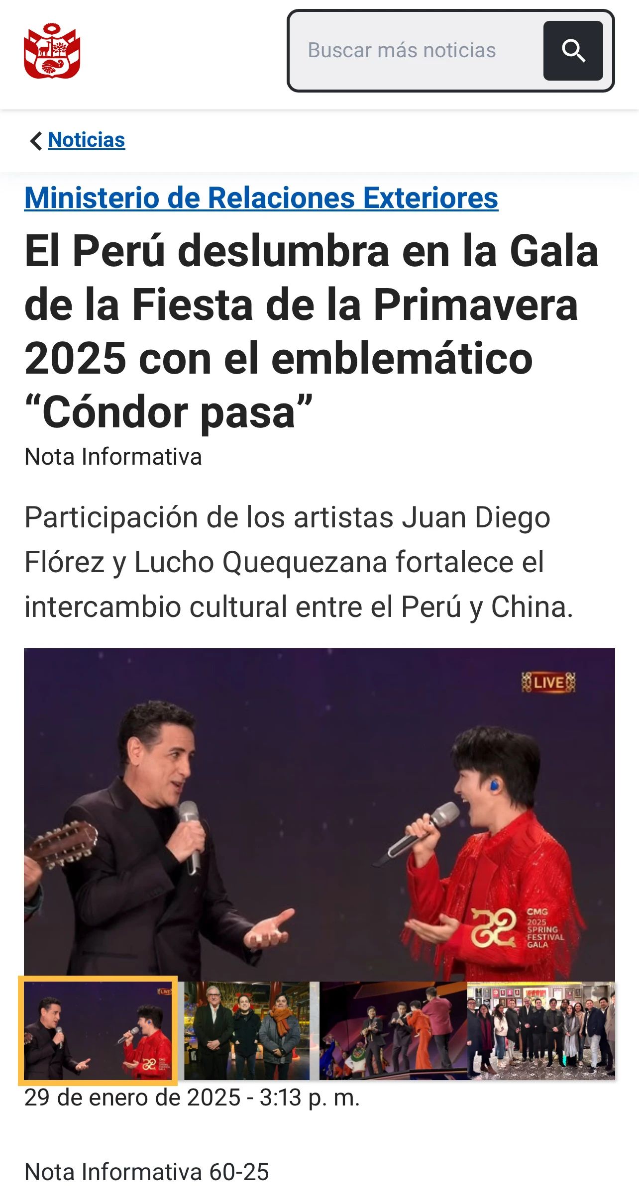 当地时间1月29日,秘鲁外交部在秘鲁政府官方网站发文,高度评价在《2025年春节联欢晚会》上表演的歌曲《山鹰和兰花花》,并认为“秘鲁与中国之间的友谊与文化交流再次得到了巩固”。