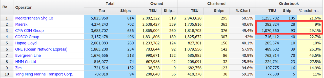 且该公司还有可能被排名第三的法国CMA CGM超越的危险,根据2024年5月,Alphaliner显示的数据,加上当时相关公司的手持订单情况,在未来所有的新船交付后,排在世界第三的达飞轮船CMA CGM可能在未来一段时间内在总运力规模上超过马士基。这样马士基的海上运力规模排名恐将进一步下跌至第三位。