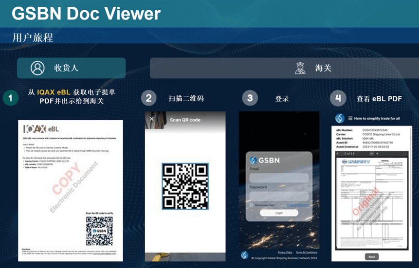 哥伦比亚进口商现在可以通过IQAX eBL电子提单上专属二维码,递交给海关人员,实时通过GSBN Doc Viewer应用程序进行真实性验证,确保提单真实有效,大大提升了海关核验效率。