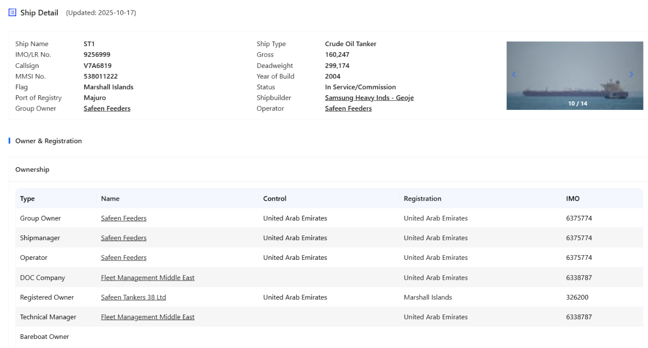 这笔VLCC收购紧随Noatum于今年8月购买的一艘LR1型成品油轮——“VS88”号(原名Amazon Beauty,建于2004年,载重7.3万吨) 之后。两艘船均来自同一家UAE船东VS Shipping,显示AD Ports正在逐步完善其油轮资产结构。