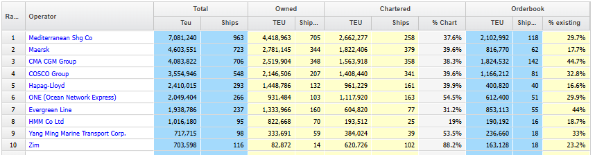 Alphaliner最新数据显示,目前MSC旗下经营的船队规模达到了963艘,总运力超过了700万TEU达到708万TEU,此外,该公司还拥有118艘新造船订单,订单运力达到210万TEU。