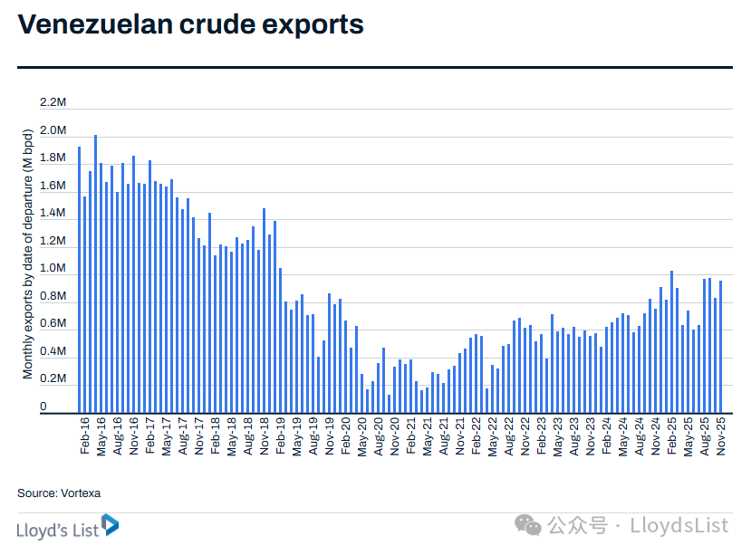 韦赫说:“但对委内瑞拉而言,这看起来将变得越来越重要,因为美国可能愿意且有能力影响其物流,至少也能显著抬高成本。出口已经呈下降趋势,这种趋势很可能会持续。”