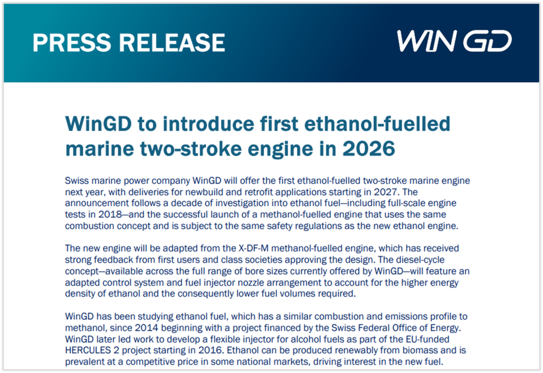 值得注意的是,WinGD 多年前就已开展乙醇研究,完成过全尺寸发动机测试,并在欧盟 HERCULES 2 项目中主导开发兼容多种酒精燃料的可变喷射系统。公司管理层坦言,“十年前很少有人相信乙醇会走到今天这一步”,而如今,乙醇已经从实验室研发,走向明确的商业化产品路线。WinGD 也成为全球乙醇协会(GEA)的创始成员之一,希望通过产业协同推动乙醇燃料在航运业的落地。