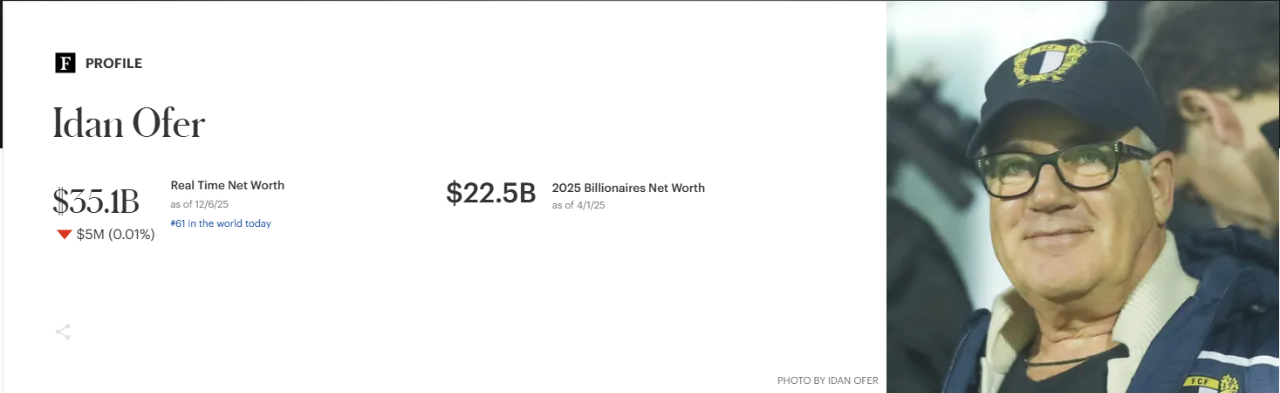 在福布斯 2025 年全球亿万富豪榜上,Ofer 兄弟依旧是航运圈最亮眼的名字。哥哥 Eyal Ofer 以约 282 亿美元 的净资产位列全球第 68 位,继续稳坐“以色列首富”的位置;弟弟 Idan Ofer 则以约 225 亿美元 排在全球第 89 位,同样跻身全球顶级富豪之列。