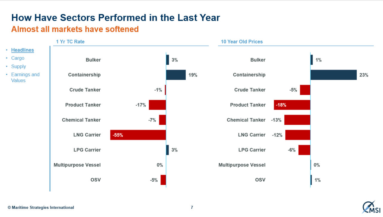 Adam Kent 指出,过去一年各细分板块的资产价格与租金整体呈现下行趋势,尤其是 LNG 船和部分能源运输资产的跌幅更为明显。