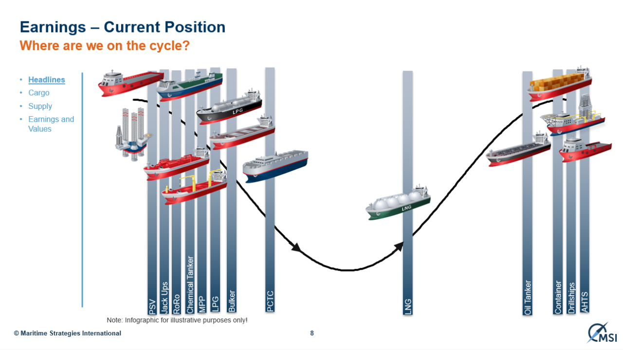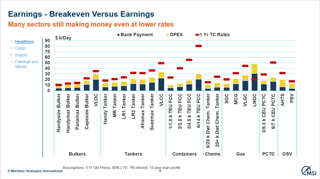 然而,市场并不是进入“崩盘”模式,多数船型的收益依旧高于盈亏平衡点,资本回报仍保持吸引力。