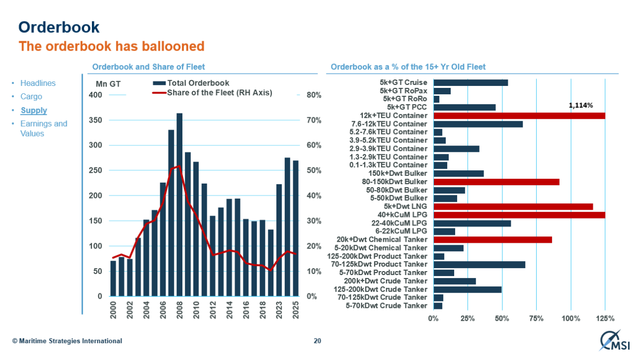 Adam Kent 指出,2024年的新船订单量刷新历史第二高纪录,但由于全球船队规模更大,因此订单占比仍不足全球船队的20%,并未达到典型的“过热”状态。