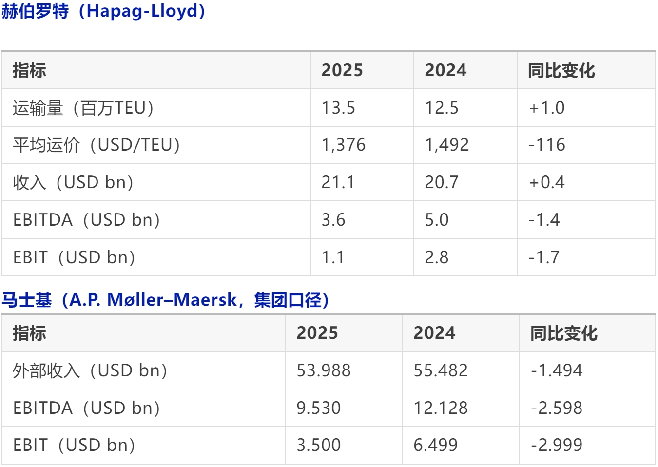 说明:赫伯罗特披露为“初步业绩”(preliminary figures);马士基为年报披露口径(consolidated totals)。