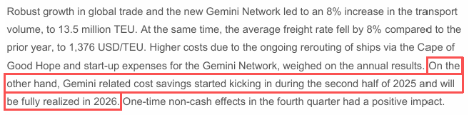 从2025全年到2026年初的最新表述来看,Gemini的“成效初显”,并不意味着行业景气重新走强,而是意味着:在运价回落、绕航成本高企的背景下,联盟网络所带来的效率红利,正在真实地进入财务报表。