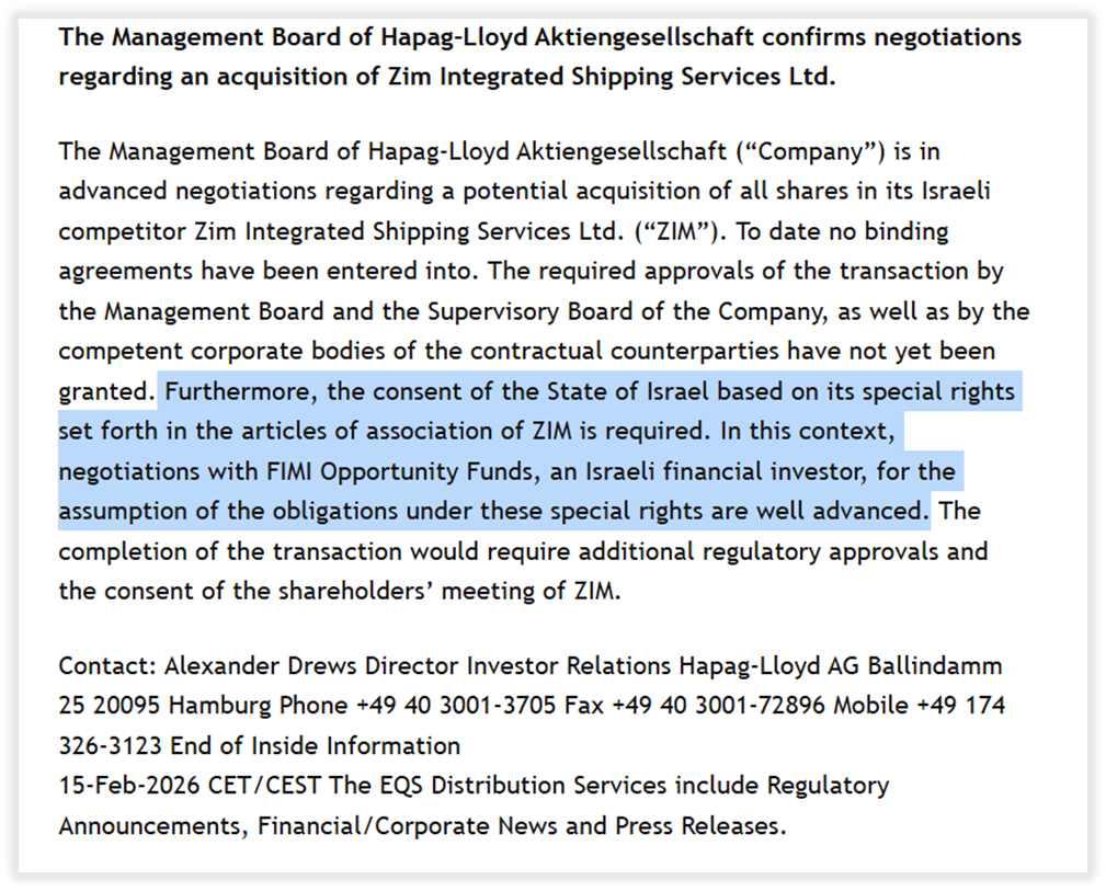 2026年2月15日,围绕纽约上市的以色列班轮公司ZIM Integrated Shipping Services的收购传闻,终于迎来买方层面的官方确认。德国班轮巨头Hapag-Lloyd当日发布依照欧盟《市场滥用条例》(MAR)披露的内幕信息公告,确认其管理委员会正就收购ZIM全部股份进行“先进阶段的谈判”。不过,赫伯罗特同时强调,截至目前尚未签署任何具有法律约束力的协议,交易仍处于谈判与审批通道之中。