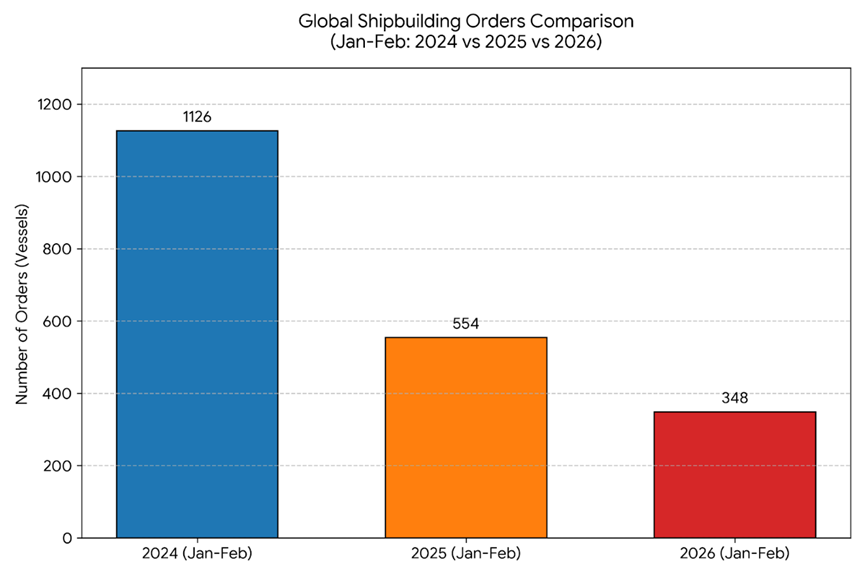 2026年的前两个月,全球航运与造船市场频繁接单。根据Clarksons最新披露的新造船订单数据,2026年1月至2月,全球共签订约348艘新船订单。如果单看这个绝对数值,相比于2024年同期的1126艘和2025年的554艘,今年的订单数量出现了肉眼可见的“骤降”。