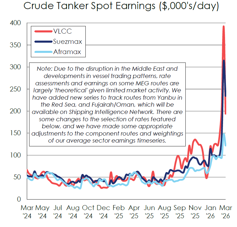 Clarksons最新周报指出,中东冲突进入第二周后,油轮与能源市场仍受到重大冲击,霍尔木兹海峡船舶通行量仍较正常水平低约95%,且对船舶、港口和炼厂的袭击仍在继续。报告同时指出,虽然油轮市场较前一周出现“普遍走软”,但VLCC平均现货收益仍约在18万美元/天左右,整体仍处于极高水平。