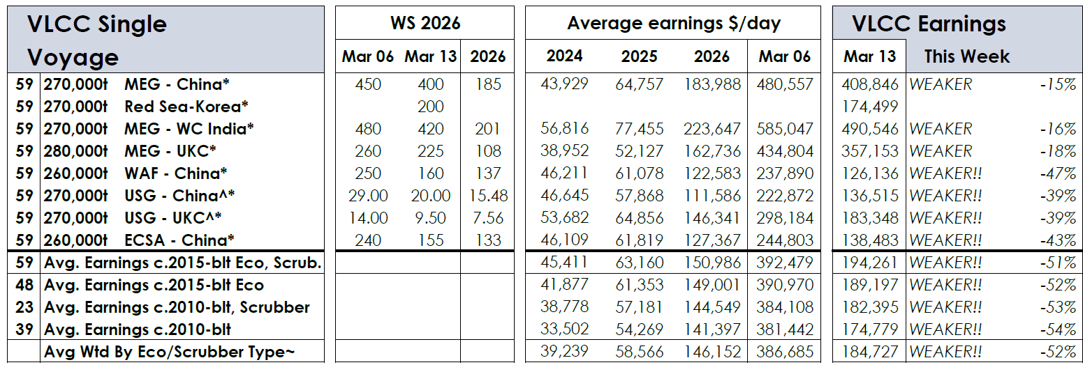 从Clarksons 3月13日数据看,VLCC主要航线运价虽然较前一周明显回落,但大部分核心航线收益仍维持在非常可观的水平。