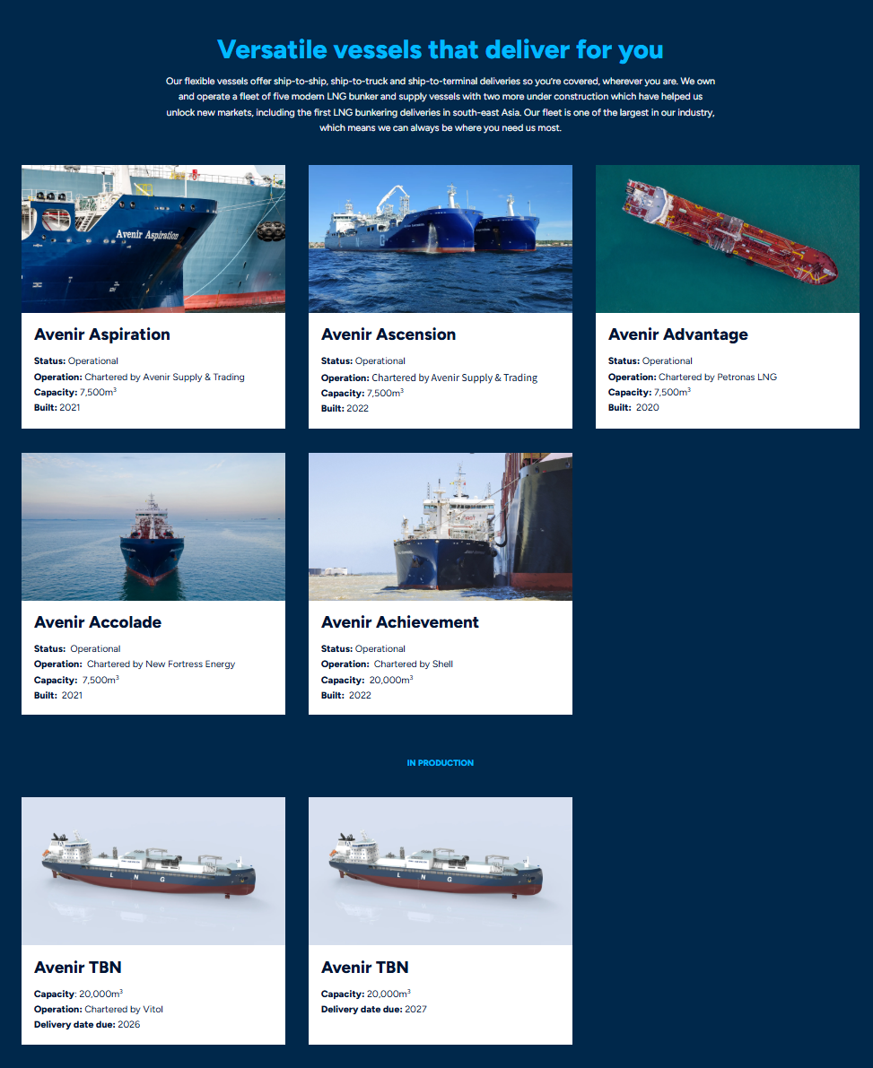 据信德海事了解,Avenir LNG 成立于 2017 年,主营 小规模LNG 供应和LNG 加注业务。它的核心定位是围绕 LNG 燃料供应链做平台化运营。目前,Avenir LNG 拥有并运营 5 艘 LNG加注船,另有 2 艘在建。