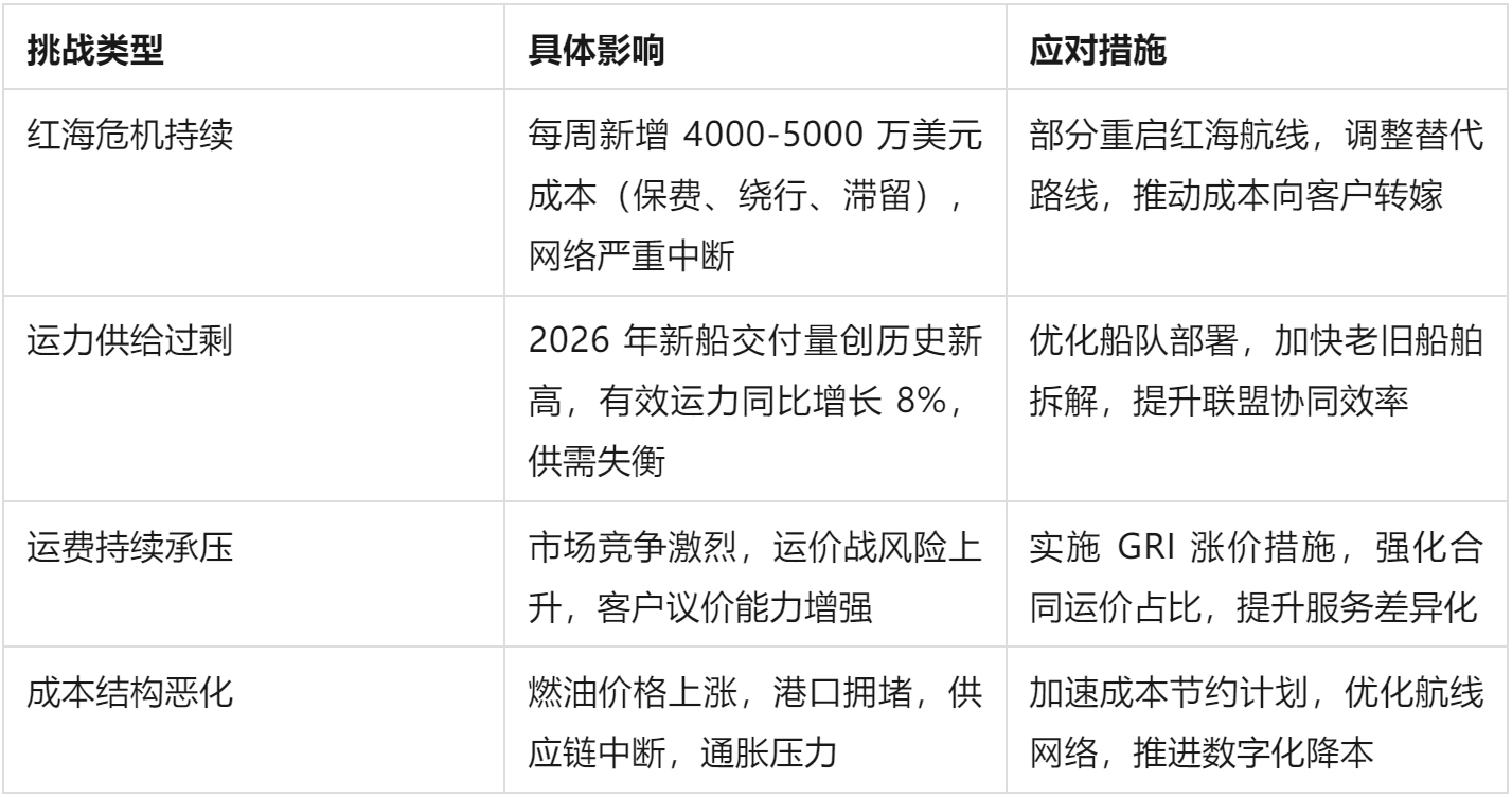 ● Gemini 联盟深化:与马士基合作的 Gemini 网络已成为行业可靠性标杆,2026 年将完全实现成本节约目标,预计年节省超 5 亿美元